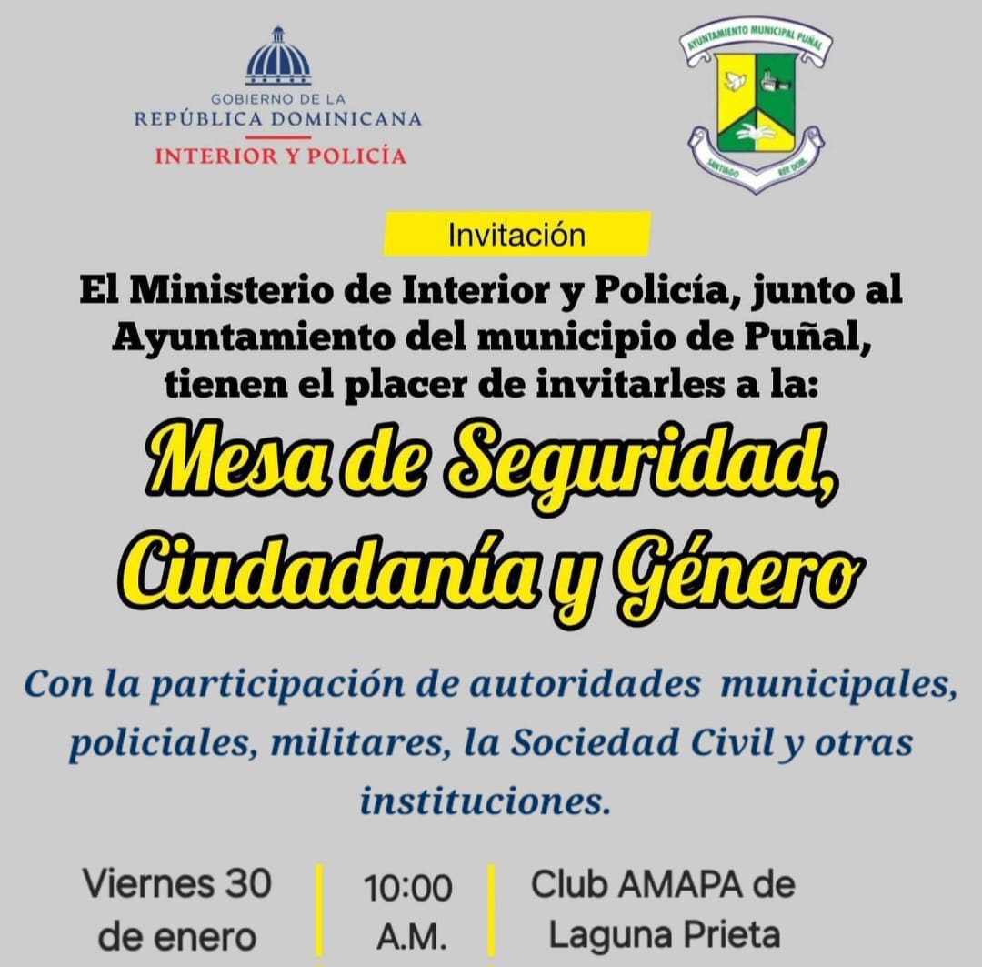El Ayuntamiento del Municipio de Puñal junto al Ministerio de Interior y Policía invitan cordialmente a la Primera Mesa de Seguridad, Desarrollo y Género del año 2026, un espacio de diálogo y coordinación entre autoridades municipales, sociedad civil y representantes militares. Su participación es muy valiosa para fortalecer las estrategias de seguridad, desarrollo y equidad de género en nuestra comunidad.