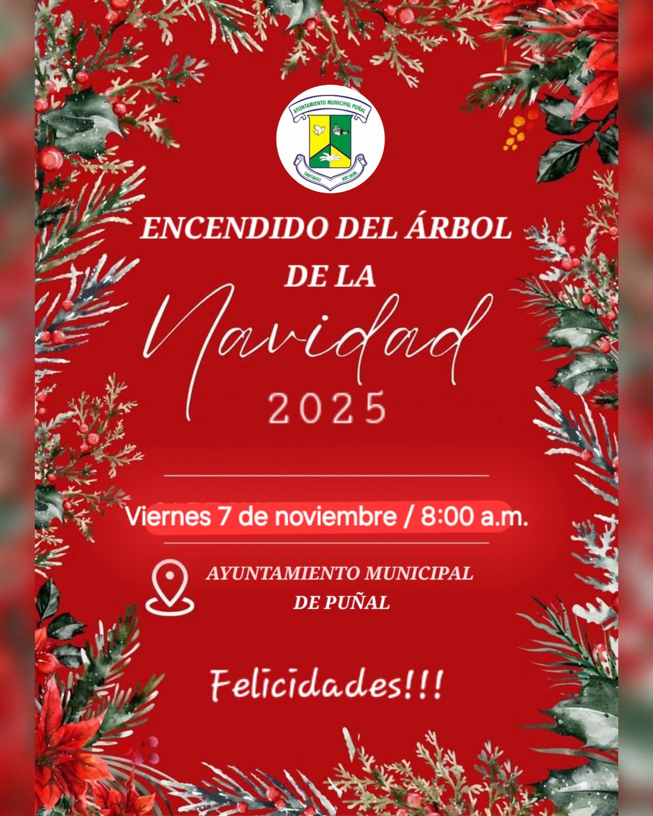Con grato placer el alcalde del Ayuntamiento del Municipio de Puñal Dr. Enrique Romero tiene el placer de invitar a todo su personal de trabajo, amigos y vecinos al encendido tradicional del árbol de navidad del Ayuntamiento Municipal de Puñal.